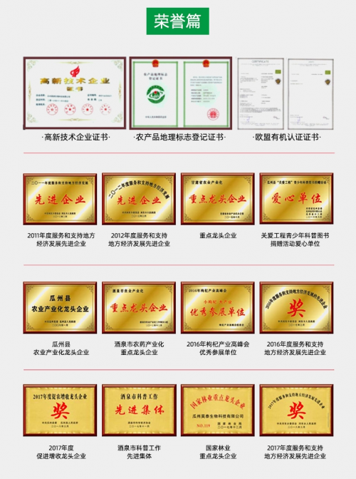 并通过这几年的不懈发展公司被国家、省市县有关部门认定为国家林业重点龙头企业、国家林业标准化示范企业、甘肃省高新技术企业、甘肃省农业产业化重点龙头企业、甘肃省瓜州昊泰枸杞农业产业化联合体、甘肃省绿色工厂、甘肃省“专精特新”中小企业、甘肃省科技型中小企业、酒泉市农业产业化龙头企业、酒泉市技术研发示范中心、酒泉市创新性企业、酒泉甘草加工工程技术中心、酒泉市企业技术中心、酒泉市科普教育基地、瓜州县龙头企业等35项荣誉。