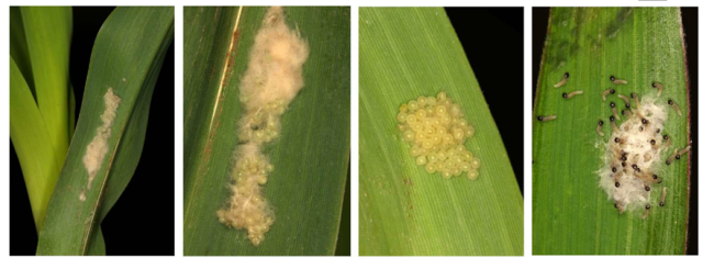 草地贪夜蛾卵块和初孵幼虫 图源平乐县植保站