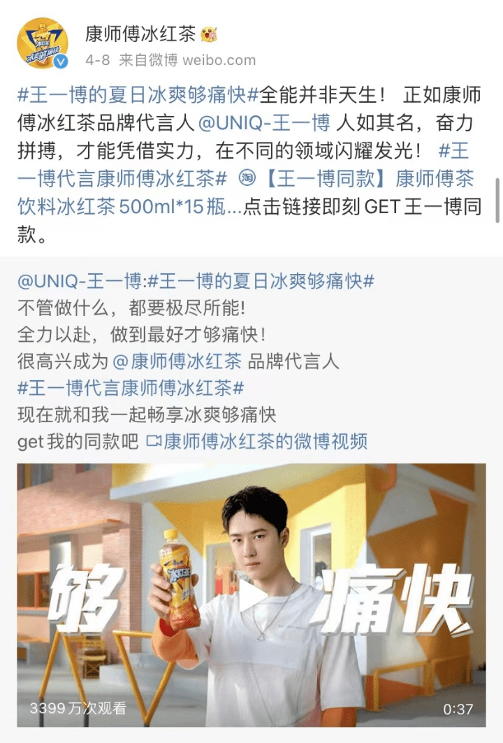正如前文所说,在传递品牌精神,提高品牌认知度方面,一个好的代言人都能起到极大的作用。康师傅冰红茶在选择王一博代言时,就已经打好了借势代言人特点,传播品牌价值主张的基础。