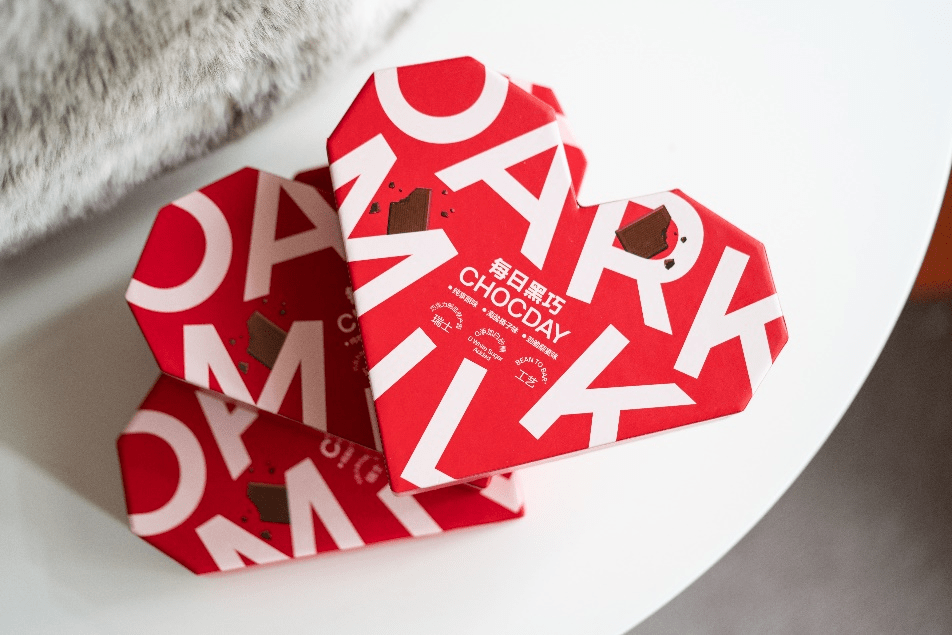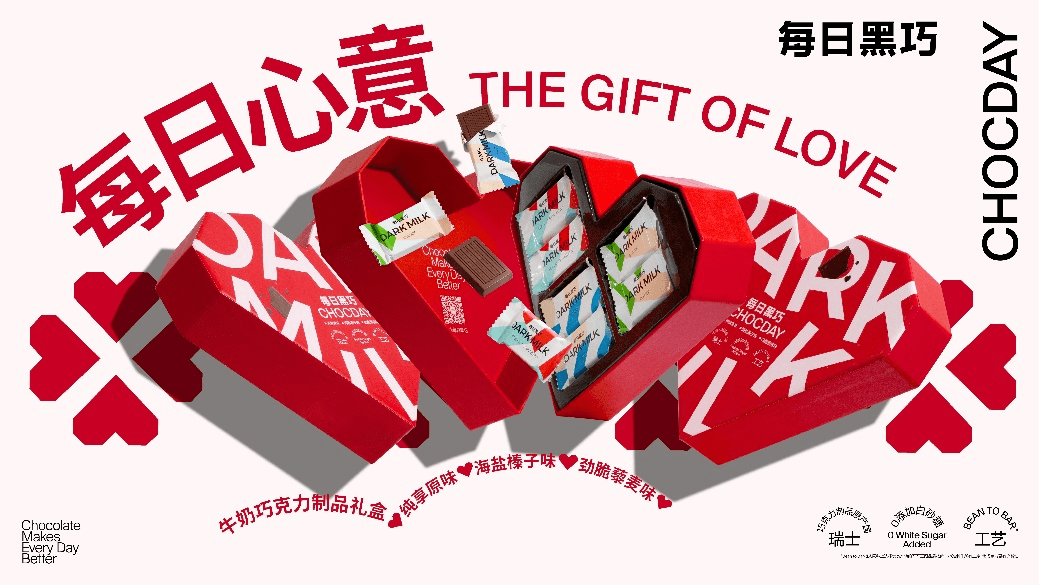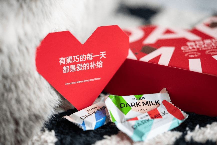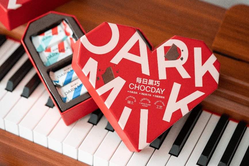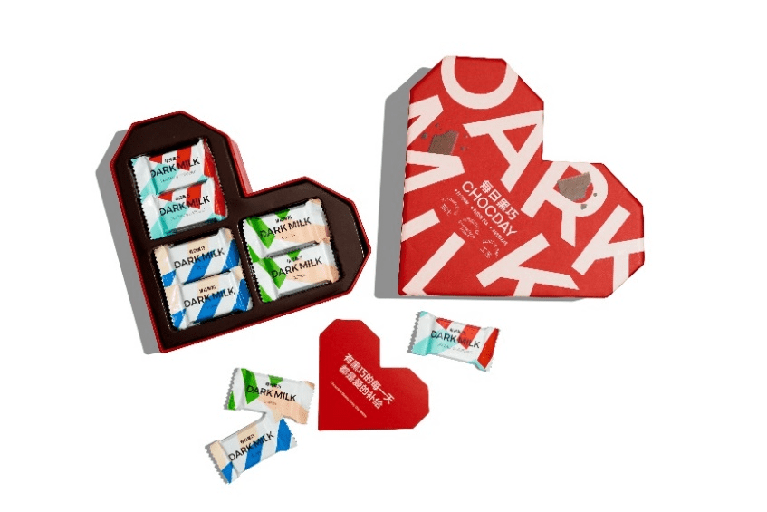 礼盒整体采用心形外观,似怦然的爱,“DARK MILK”的英文跃然于红色主调之上,时尚不失趣味。内附爱心祝福卡片,以温情文字承载“爱在每日”的美好祝愿,充满爱的仪式感。
