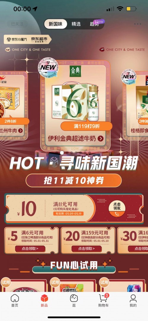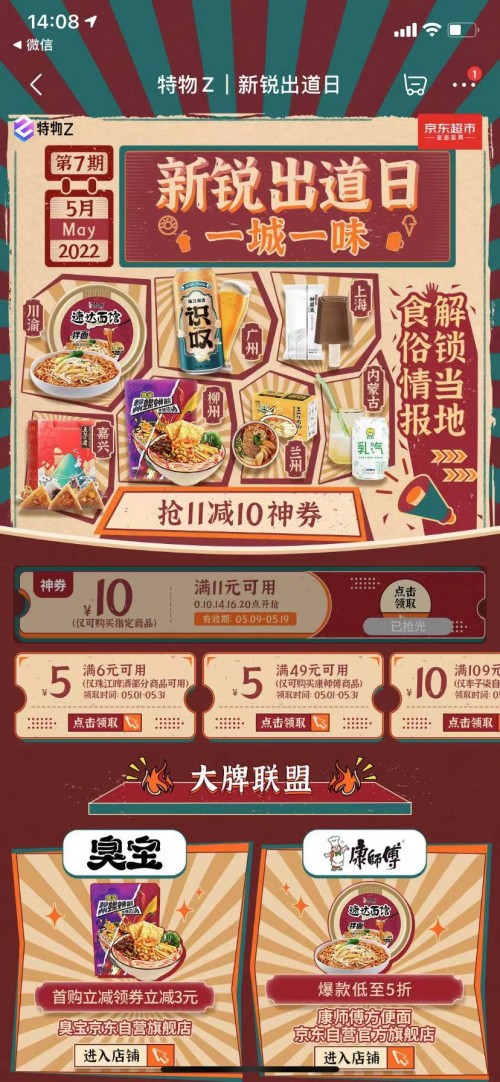5月8日-5月10日,京东超市整合资源,康师傅、臭宝、统一、珠江啤酒、五芳斋、钟薛高、伊利7大国潮品牌共建“地域美食联盟”。于京东首页下拉2楼的“特务Z”频道,重磅上线了【一城一味 新锐出道日】的吃货盛宴。