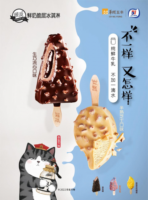 为此,五丰臻我还推出了臻我半熟芝士口味冰淇淋,纯鲜牛乳制成的半熟芝士味冰淇淋,包裹在混入了美国扁桃仁脆粒的巧克力脆层中,细腻爽滑,脆香满口。未来,希望五丰臻我能够通过与吾皇猫的联名活动,吸引更多潜在消费者的关注,成功为市场作出创新发展的表率!
