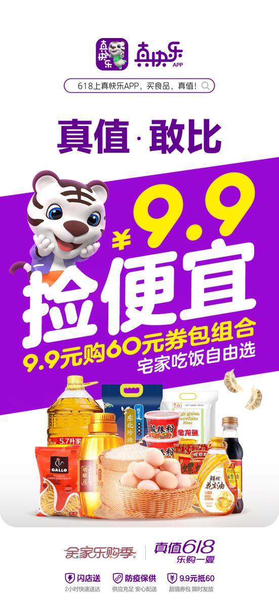 尤其是在5月25日—5月31日活动期,其线上平台真快乐APP解锁预售新玩法,推出“9.9元抢60元”优惠礼包:凡是上真快乐APP购买“9.9元抢60元”自由购物包,就能获得满11减10,满49减25,满99减25的三款优惠券。该优惠券在6月1日—6月20日大促期间可购买部分百货商品使用,金龙鱼纯正花生油、爱心农场五常稻花香米、鲁花麦芯小麦粉等粮油食品,都可享受9.9自由购优惠。此外,该优惠券包还可与平台每满200减35的优惠券叠加使用。