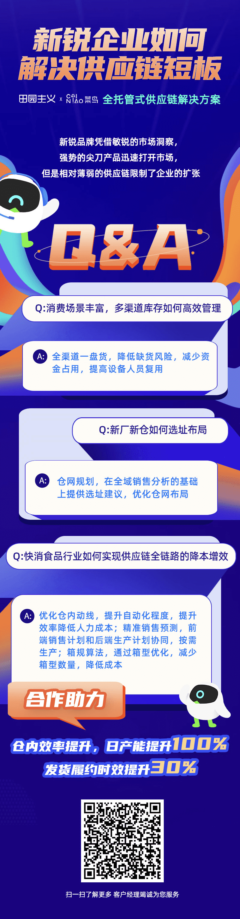 这是菜鸟供应链为这家国内健康食品新锐品牌量身打造的无人仓。针对新锐食品品牌以及短保品的痛点,菜鸟为田园主义输出了全托管数智化供应链解决方案,通过仓网规划、自动化、销量预测、全渠道一盘货等仓配领域的合作,帮助田园主义实时监控库存,降低备货周期和成本,提高资金周转率。目前的合作已使田园主义仓内效率提升20%,仅包装一项,每年可为其节省成本200万元。