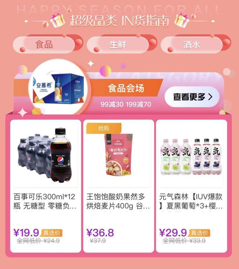 在食品会场,无糖型百事可乐300ml12瓶装低至19.9元,零糖负担,老少皆宜;王饱饱酸奶果然多烘焙水果麦片520g仅需31.9元,即食早餐,妈妈再也不用担心你的早饭问题;夏黑葡萄3瓶装+樱花白葡萄3瓶装元气森林气泡水使用优惠券后只要24.9元,给夏天聚会带来清凉享受。更有满99减30,满199减70的购物津贴,让你买的更实惠。