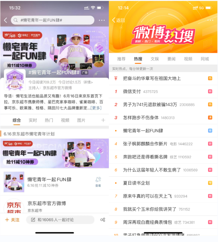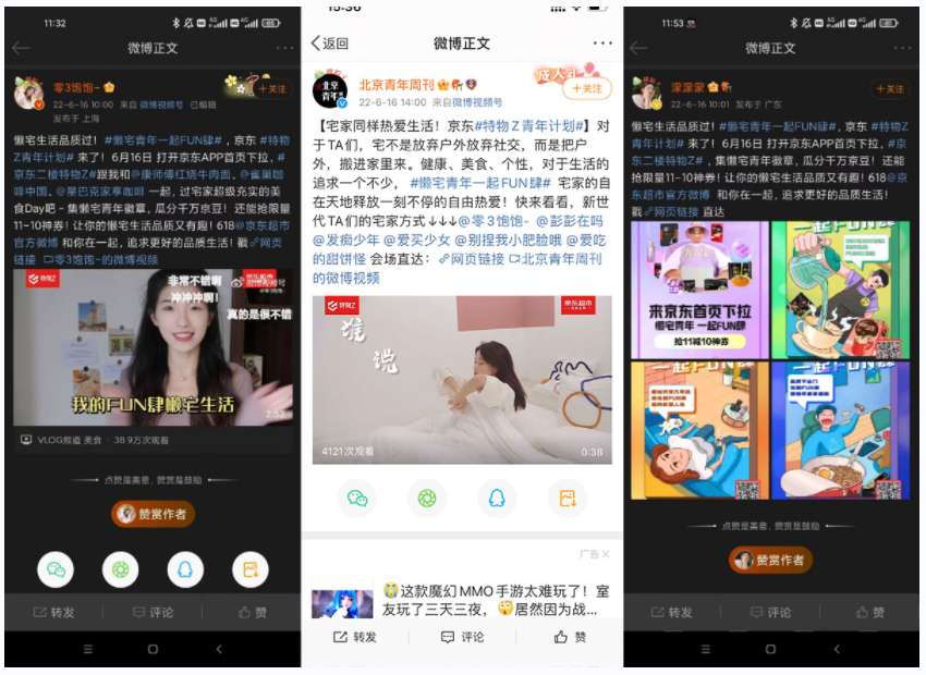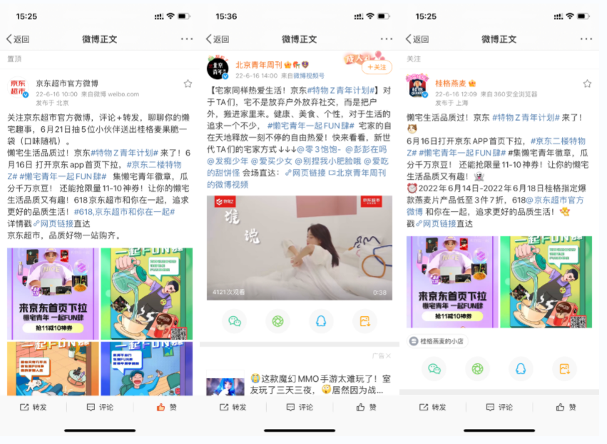 无社交不消费,社交关系年轻人的自我实现。Z时代乐于借鉴他人消费经验,并为我所用,成为消费捷径。站外社交营销以微博为传媒矩阵,引爆千万流量。微博自带传播效应,可以促进话题传播,加速活动传播。京东超市发起“懒宅青年一起FUN肆”话题,热搜强曝光。