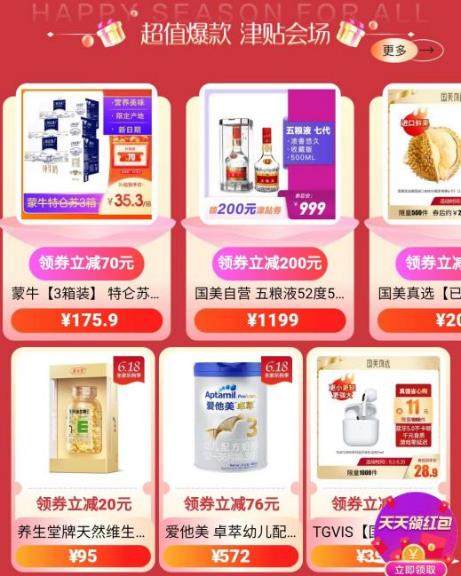 如超值爆款津贴会场,领券至高立减300:蒙牛特仑苏纯牛奶250ml*12/箱,原价175.9元,领券优惠70元,到手一箱只要35.3元;静奶奶京都一号火龙果,5斤装原价36.9元,领券后只要21.9元;兰蔻清滢柔肤水大粉水400ml,原价239元,现领券减40,到手价仅199元。