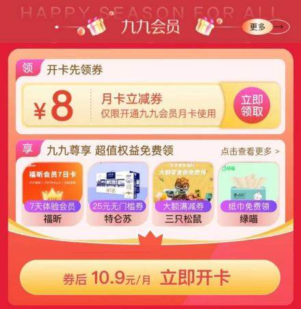 论宠粉,真快乐APP从不玩虚的。开卡先领8元月卡立减券,券后10.9元/月立得九九会员。