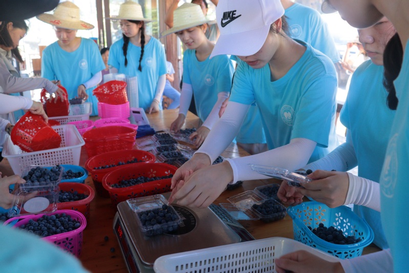 看着颗颗鲜艳饱满的果实,志愿者们辛勤的汗水也化作脸上的丝丝笑意,洋溢在蓝莓庄园清香甘甜的空气里。接着,志愿者们将采摘的新鲜蓝莓分装、称重、打包,足足有三百余斤。转眼间,一筐筐蓝莓在志愿者手中摇身一变,成了一盒盒精致的蓝莓商品,这些新鲜的蓝莓将很快销往各地超市供消费者购买。