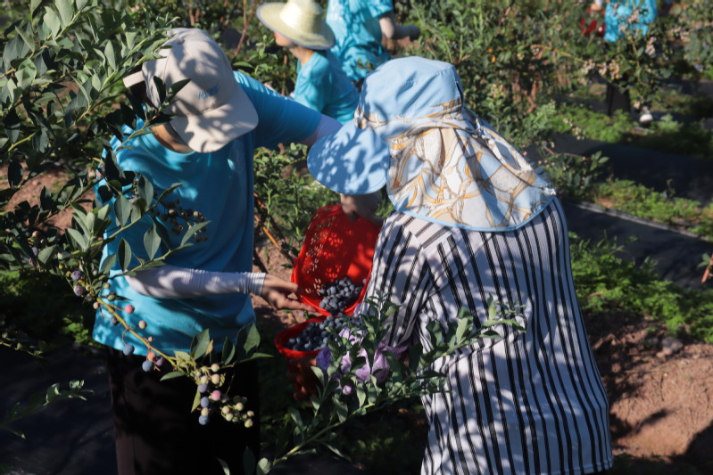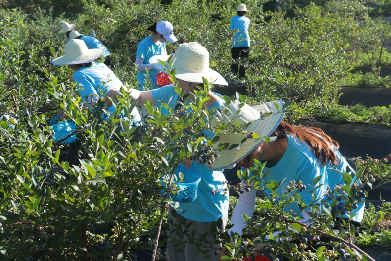 “今年蓝莓大丰收,我们根本忙不过来,多亏了你们这些志愿者们来帮忙呀!”蓝莓园农户感叹道。一大早志愿者们便早早起身,头戴草帽,手提采摘篮,迎着日出,身披露水,辛勤地穿梭在蓝莓庄园田里。大家分工协作、相互配合、将成熟的蓝莓果实收入篮中。刚开始大家都没有经验,摘蓝莓的速度较慢,在农户们耐心讲解和带领下大家渐渐熟悉采摘工作,效率越来越高,一上午就收获了满满几十筐蓝莓。