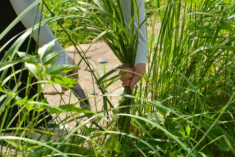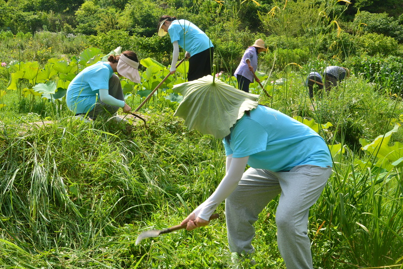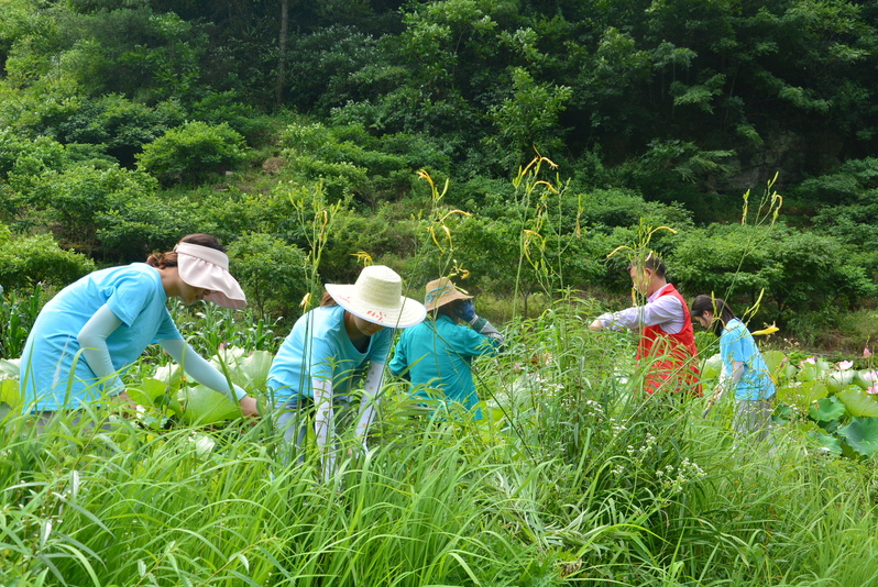 忙碌的同时,大家还不忘调侃。“这里的杂草多,我有锄头让我来”“这些杂草可真顽固啊!还好力气大”。尽管杂草众多,但志愿者们干劲十足。经历半天的奋战,在和农户的共同努力下,杂草被全面清除,道路焕然一新,基地里荷花也鲜艳了几分。“你们把除草的活儿都干完了,我们都没事情做咯”偏岩坝村长笑着说。