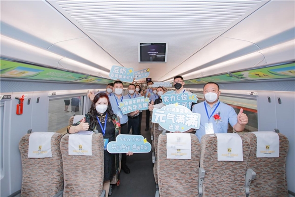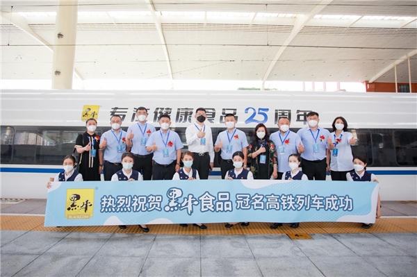 仪式活动上,领导嘉宾共同为车身揭幕,“黑牛食品”高铁冠名列车重磅亮相。广大旅客可通过“黑牛食品”高铁冠名列车的车身彩贴,加深对“黑牛”品牌的认知。同时,在列车车厢内,“黑牛”品牌基因随处可见,头片、桌贴、海报、车外门贴、品牌天幕、语音播报、LED滚动屏等全方位展示品牌形象,牢牢占据人们在出行环境下的消费空隙,让旅客在乘坐高铁的有限时间内更加直观地感受到黑牛“用心陪伴,温暖如初”的品牌魅力。