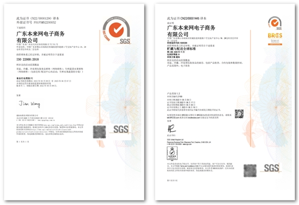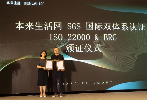 ▲本来生活网获ISO 22000:2018及BRCGS S&D认证证书