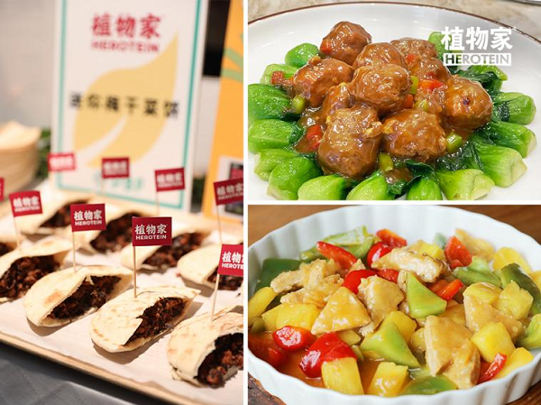 (图为使用植物家产品制作的梅干菜饼、红烧狮子头、咕噜鸡)