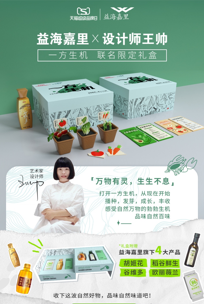 为了给无法亲自到现场感受自然魅力的粉丝们一点小“补偿”,益海嘉里还联名打造了《一方生机》限量礼盒,特别邀请知名艺术家设计师王帅创作礼盒封面。以益海嘉里产品的原料稻谷、花生、橄榄描绘大自然,体现自然的治愈感。