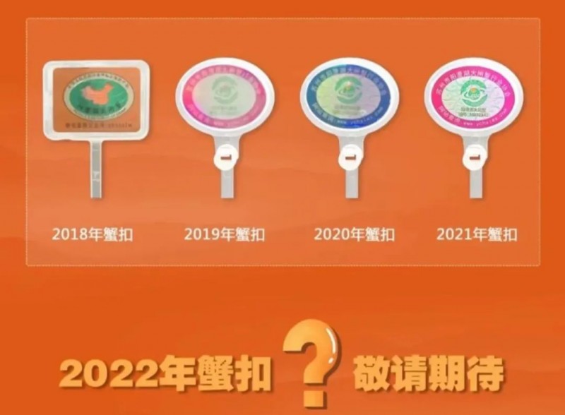 每只“阳澄湖”大闸蟹必须带有一枚蟹扣,代表着不同的养殖区域,相当于独一无二的“身份证”。