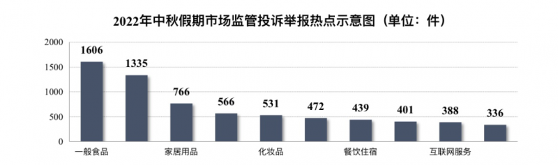 其中,一般食品(1606件)、服装鞋帽(1335件)、家居用品(766件)、销售服务(566件)、化妆品(531件)等投诉举报量居前。