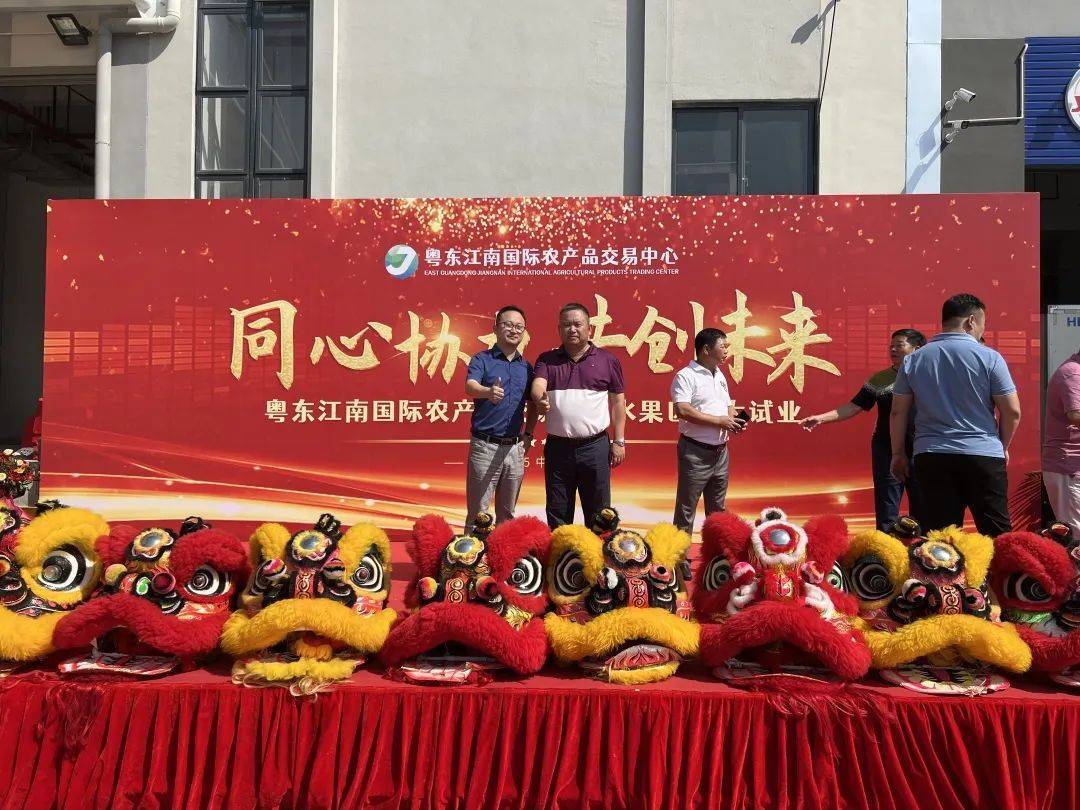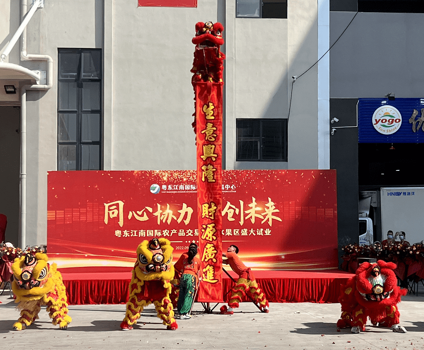 首先由黄镇裕董事长和叶灿江董事长分别为两只舞狮“点睛”,完成了传统的醒狮仪式,象征着江南市场的生意从此蒸蒸日上、繁荣兴盛。接着,鼓声雷鸣、锣声大响,舞狮在地上蓦然腾起、起舞拜礼。伴随着一阵阵鞭炮声,狮嘴里吐出了“生意兴隆、财源广进”的红底金字的吉祥条幅,在现场嘉宾和商户们的欢呼声中,粤东江南国际农产品交易中心水果区试业庆典正式开始。现场有多家广东省内外新闻媒体都对此盛况进行了采访报道、现场直播。