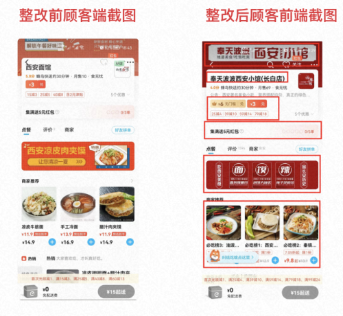 以某家“西安小馆”为例,“饿管家”诊断其店铺装修有短板,而且因没有设置招牌菜和套餐,导致菜品吸引力不足。“饿管家”给出的相关整改建议是:调整店铺招牌及橱窗、新增招牌菜和套餐、适当提升活动力度、优化菜单结构。调整的效果立竿见影,店内客单价提升了10.8%,订单收入增长了11.2%。