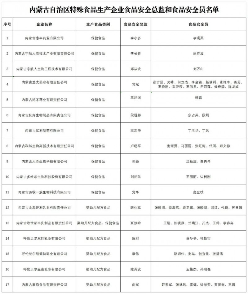 内蒙古自治区特殊食品生产企业强化主体责任落实食品安全总监和食品安全员全部配备到位