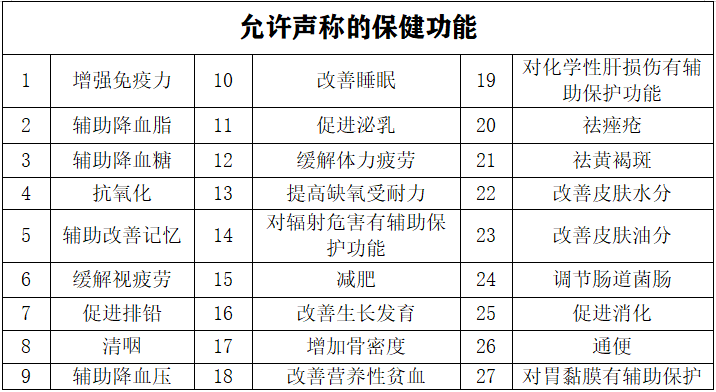 目前,监管部门依法批准注册备案的保健食品中,允许声称的保健功能共有27种,以及补充维生素矿物质的营养素补充剂。