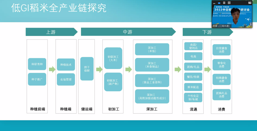 江南米道创始人之一的陈媛女士在会议上做了关于“低GI水稻全产业链研究与实践”的主题演讲。
