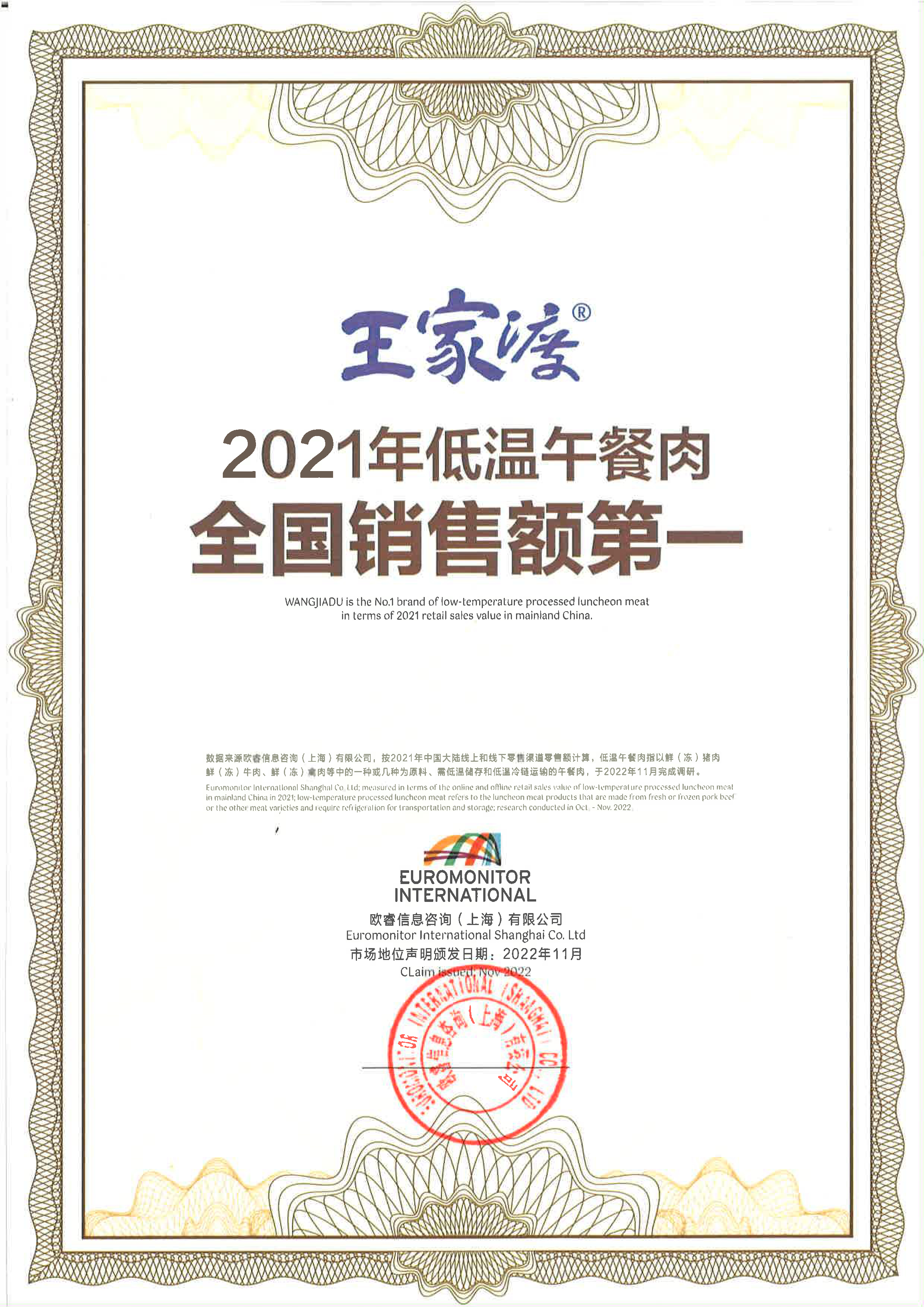 王家渡品牌低温午餐肉凭借它独特的品质与口感,长期以来获得无数消费者的一致认可与喜爱,销量一路走高,在刚刚由欧睿信息咨询(上海)有限公司完成的2021年低温午餐肉品牌&品类调研中,王家渡低温午餐肉获得「2021年低温午餐肉全国销售额第一」,真正实现用品质见证实力。