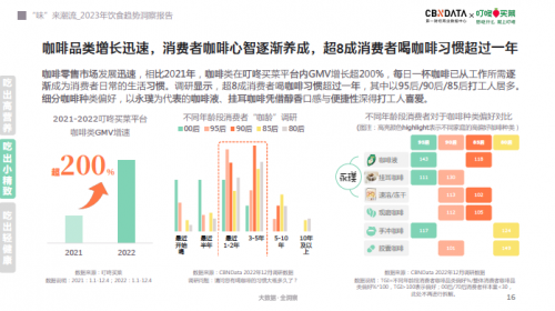消费者对咖啡偏好的增长也是饮食消费升级的显著特征之一,据叮咚买菜平台数据显示,2022年咖啡类的年GMV增速超过200%。伴随咖啡零售市场迅速发展的,便是消费者的咖啡习惯,据《报告》显示“咖龄”超过一年的消费者超过8成。近年来也培养出了细分的咖啡种类偏好:以永璞为代表的咖啡液、挂耳咖啡深受95后、90后、85后的喜爱。