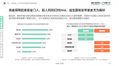 提及“高营养”就不得不提现代消费者眼中较为看重的营养要素,根据《报告》数据显示,前三甲分别为蛋白质、膳食纤维和维生素。有娃家庭则是更在乎助力宝宝成长的DHA和益生菌的摄取。