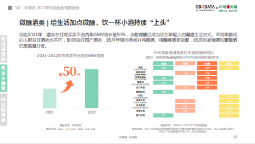 面对无处不在的内卷焦虑,“喝一杯”自古以来便是人们疏压解忧的方式之一,而在现代则表现为“下个单”在家就能小酌微醺:据叮咚买菜平台数据显示,2022年酒类的年GMV增速高达近50%。对于酒类的偏好上,现代年轻人则更爱果酒、鸡尾酒、精酿啤酒等度数偏低的酒,享受那种微微上头舒缓情绪的快感。