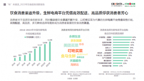 消费者在饮食消费需求上的品质化升级,也助推了饮食消费渠道的万象更新,尤其是生鲜电商的高速增长。据《2022年中国生鲜电商运行大数据及发展前景研究报告》的数据显示,近7年来中国生鲜电商市场规模逐年扩大,预计到2023年将突破4000亿。