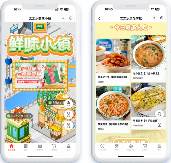 以“太太乐鲜味福利社”小程序商城为例,在“太太乐鲜味福利社”小程序商城上,太太乐与微盟共同打造了“鲜味小镇”。“我们的核心是打造内容场景,向消费者传递鲜味知识,希望通过沉浸式互体感达到品牌种草的目的,增加用户交互及黏性,提升会员增量。”Irene 称。