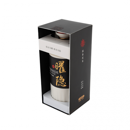 曜隐STARHIDE功倍盒采用环保折叠纸盒的创新设计,盒子由一整张环保硬卡折叠、粘贴而成,大小、形态上可以完美匹配、收纳曜隐定制对饮版酒具,开盒饮用由此更具仪式感。