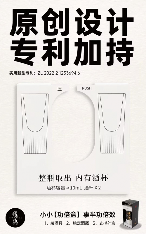 2021年,曜隐STARHIDE凭借“节气瓶”在白酒界出道即出圈。仅一年多的时间,曜隐STASRHIDE再次重磅推出集内置酒具和稳定酒瓶功能于一身的功倍盒专利设计(专利号:ZL 2022 2 1253694.6),创新白酒包装新玩法,彻底打破大众对于白酒包装的刻板印象。