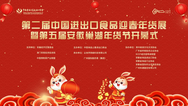 2023年1月13日上午,在安徽巢湖经济开发区管委会、澳门贸易投资促进局和中国预制菜产业联盟支持下,由中国食品土畜进出口商会主办、云食界网络科技有限公司和广州国际医药港(集团)有限公司承办的第二届中国进出口食品迎春年货展暨第五届安徽巢湖年货节开幕式在中国(安徽)5G国际食品城成功举办。
