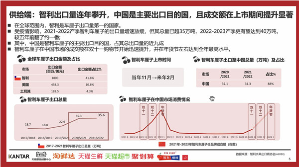 同时结合消费者对生鲜果蔬快速送达的需求,以及“携水果出游”的新消费趋势,阿里巴巴B2C生鲜事业部重点发力近场电商业务“淘鲜达”,提供最快1小时送达服务,让消费者在繁忙的生活中可以随时随地轻松吃上新鲜的智利水果,进一步助力智利水果消费的提升。