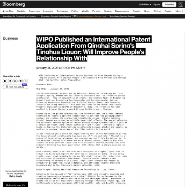 美国彭博新闻社在报道原文中写道,“从人类在美索不达米亚平原开始酿酒至今,万年时光中,酒精与人类的关系可谓是‘相爱相杀’。它让人灵感无限,愉悦享受,无惧生命的苦难与阻碍,又给人带来了疾病与伤害。现代医学研究也发现了过量饮酒带来的诸多问题,甚至适量饮酒也受到质疑,宣称喝一滴都有害。行业专家认为:听花酒这项发明专利,以减害增益为目标,将会给中国白酒乃至世界蒸馏酒的底层逻辑和技术方向带来革命性的突破,让酒与人走向和谐共生的全新关系。人们对酒精饮料的认知、价值判断和消费观念,资本的行业估值逻辑等,或将由此发生巨变”。