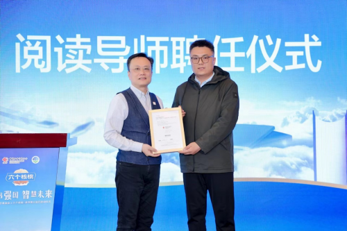 (中国红十字基金会副秘书长郭阳向山东曲阜陵城镇杏坛小学卢宁老师颁发此次活动“阅读导师”聘书)
