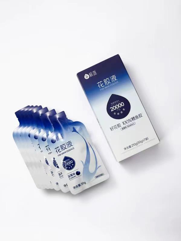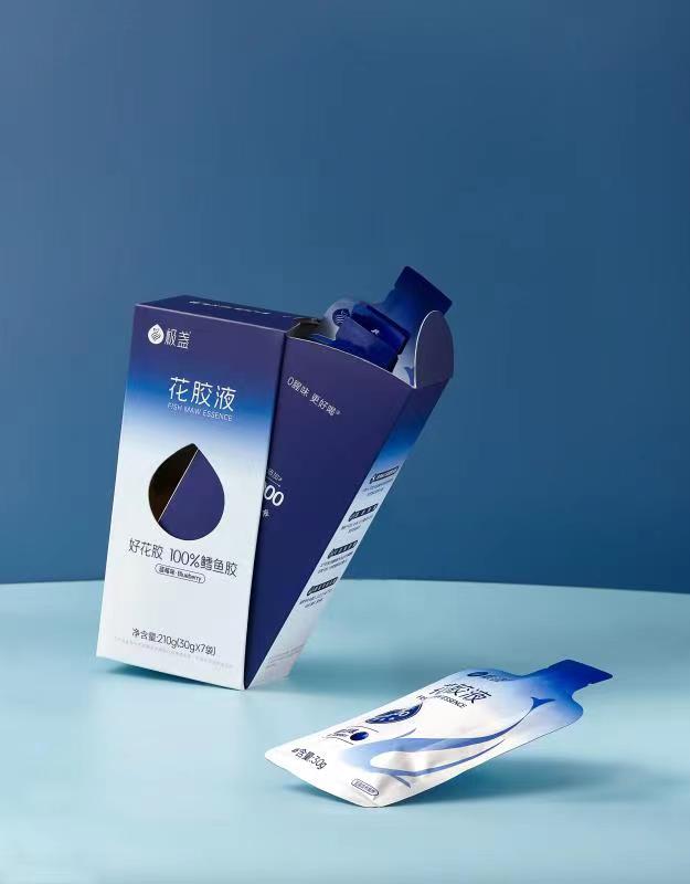 我们采用北极深海野生鳕鱼胶,保证了胶原蛋白的天然性和优质性,用国家去腥专利技术和已申请专利酶解技术,把干花胶酶解成液态花胶,让消费者可以随时随地喝上新鲜的花胶液,这一技术还可以有效地去除腥味,让花胶的口感更加鲜美。与此同时“坚守干净配料表”是我们的底线,每一袋有20g花胶原液,加入适量蓝莓浓缩汁和维C、用赤藓糖醇代替蔗糖,天然营养,并且更符合年轻人口味”。我们希望用户可以随时随地放心地喝上一袋“好喝的天然胶原蛋白”。