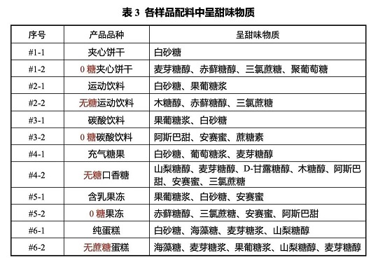 本次实验样品选取了市面上常见的声称为无糖食品和普通食品各6批次,分别为:夹心饼干/0糖夹心饼干、运动饮料/无糖运动饮料、碳酸饮料/0糖碳酸饮料、充气糖果/无糖口香糖、含乳果冻/0糖果冻、纯蛋糕/无蔗糖蛋糕。