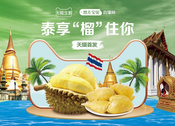 今年4月12日,天猫生鲜将邀请泰王国驻广州总领事馆商务领事陈丽玲女士,在淘宝头部主播烈儿宝贝的直播间内带来品质上乘的泰国榴莲首发。届时,第一批新鲜上市的泰国榴莲,将第一时间运抵中国送到广大消费者的手上。