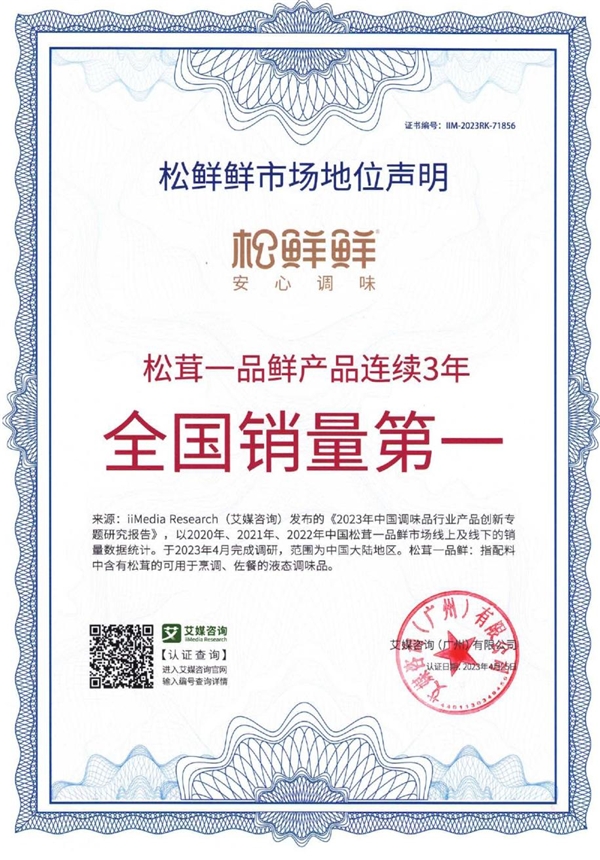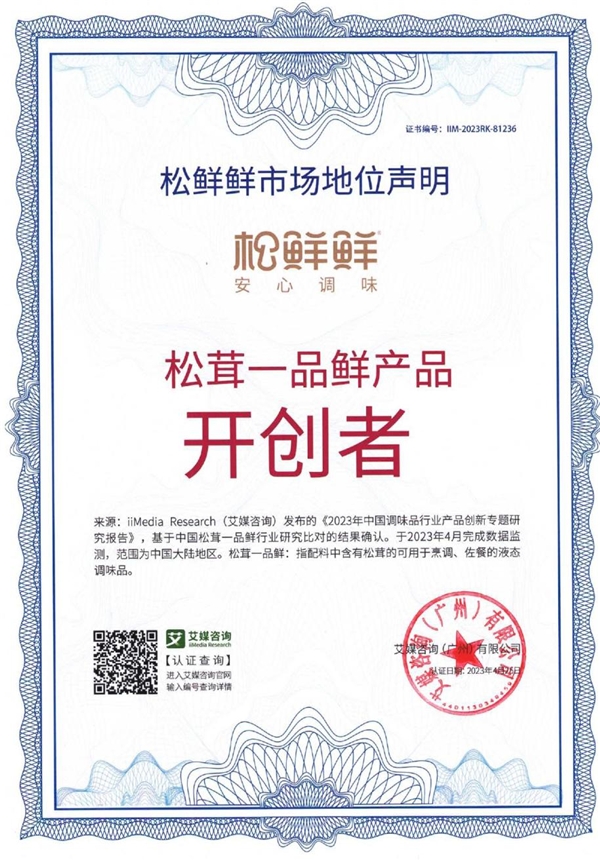2023年4月,松鲜鲜荣获全球新经济产业第三方数据挖掘和分析机构iiMedia Research(艾媒咨询)授予的“松茸一品鲜产品开创者”与“松茸一品鲜产品连续三年全国销量第一”双料市场地位声明认证。
