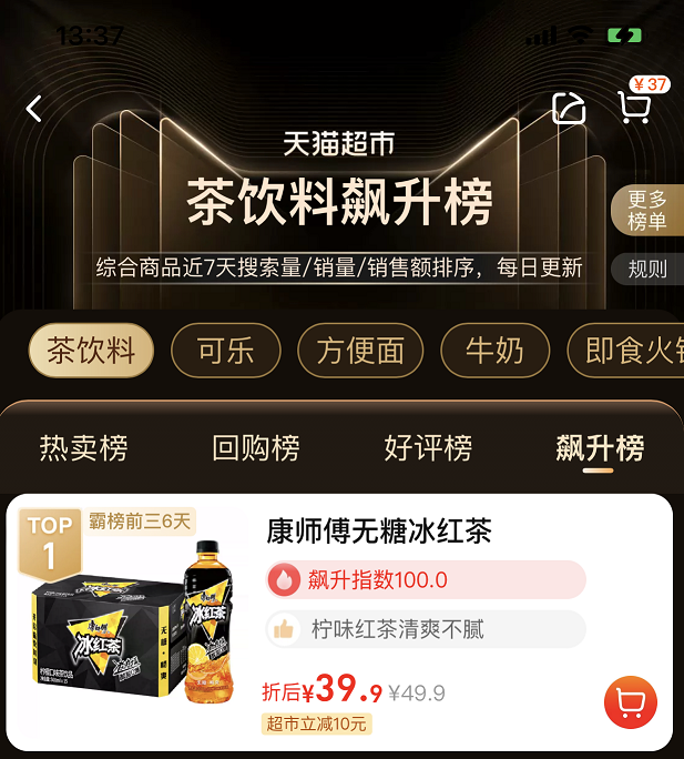 一个显见的事实是,康师傅今年还借力头部产品“康师傅冰红茶”的品牌资产,将旗下的“无糖冰红茶”进行全新升级——柠檬新鲜感大幅提升、酸甜层次感分明,代糖感直线下降,一经推出便在猫超茶饮飙升榜上占据首位,不仅彰显了“茶饮一哥”的地位,也表明其通过升级自身产品,成为了年轻消费者的第一触点。
