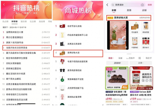 在#食养是良医 和#全民都是营养家 抖音话题下,不同类型作者分别聚焦青年营养、女性营养、儿童营养、父母营养等方向,根据自己的知识水平和生活经验持续输出优质内容。很多营养师还通过朗朗上口的顺口溜宣传科学食养理念,帮助更多人掌握健康的饮食方式,在抖音掀起了讨论热潮,截至发稿,抖音话题#听了营养师的话感觉我又行了 播放次数超2000万。美食、育儿、生活、科普等多类型达人则通过烹饪教程、剧情演绎、测评种草等营养相关短视频进行场景化种草,帮助用户在抖音电商学习营养搭配的同时,通过清晰的购买路径下单营养好物,提升健康生活品质。在多方力量的带动下,#当我开始关注营养美食 话题热度持续攀升,于5月11日12时登上种草榜TOP4,这也在很大程度上激发了用户对营养好物的消费兴趣,平台数据显示,“营养好物大赏”同期跃升至商城热榜TOP4。