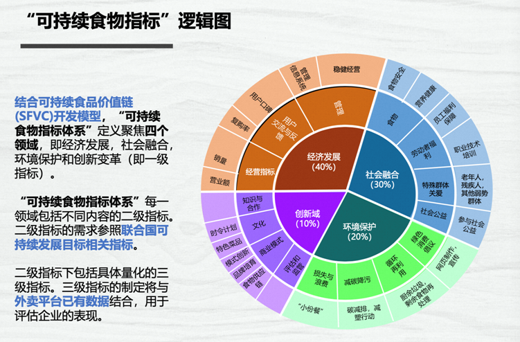 活动中,“可持续食物系统联合实验室”还发布了业内首个“可持续食物指标体系”。该指标体系参照了联合国2017年颁布的《2030 年可持续发展议程》各项可持续发展目标和具体目标全球指标框架,同时以联合国粮农组织可持续食品价值链开发模型为基准选择领域和指标,并在此二者基础上,结合法律法规、饮食文化、创新等作出调整优化。