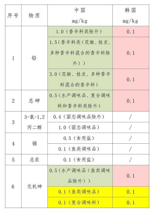 我国主要对调味品中的铅(香辛料类除外)、铅(香辛料类(花椒、桂皮、多种香辛料混合的香辛料除外))、铅(花椒、桂皮、多种香辛料混合的香辛料)、总砷(水产调味品、复合调味料和香辛料类除外)、3-氯-1,2丙二醇(固态调味品除外)、3-氯-1,2丙二醇(固态调味品)、镉(食用盐)、总汞(食用盐)、无机砷(水产调味品(鱼类调味品除外))、无机砷(鱼类调味品)、无机砷(复合调味料)、和镉(鱼类调味品)进行了限量要求,韩国主要对调味品中的铅、砷、无机砷进行了限量要求。我国对无机砷(鱼类调味品、复合调味料)的限量要求与韩国相同,其余物质我国均比韩国限量要求宽松。