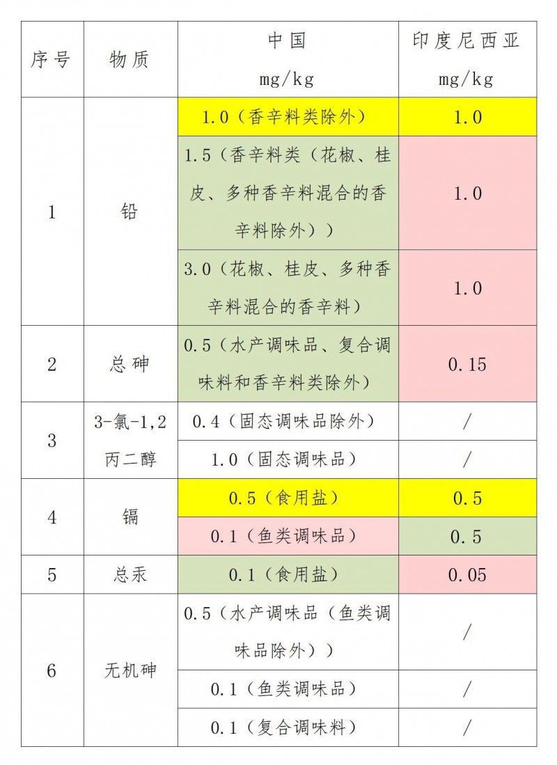 我国主要对调味品中的铅(香辛料类除外)、铅(香辛料类(花椒、桂皮、多种香辛料混合的香辛料除外))、铅(花椒、桂皮、多种香辛料混合的香辛料)、总砷(水产调味品、复合调味料和香辛料类除外)、3-氯-1,2丙二醇(固态调味品除外)、3-氯-1,2丙二醇(固态调味品)、镉(食用盐)、总汞(食用盐)、无机砷(水产调味品(鱼类调味品除外))、无机砷(鱼类调味品)、无机砷(复合调味料)、和镉(鱼类调味品)进行了限量要求,印度尼西亚对调味品中的砷、铅、汞和镉进行了限量要求,同时并未对调味品进行分类限量要求。