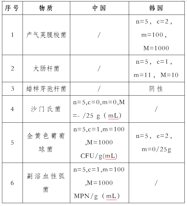 我国主要对调味品中的沙门氏菌、金黄色葡萄球菌和副溶血性弧菌(仅适用于水产调品味)规定了限量要求,韩国对调味品中的大肠杆菌、蜡样芽孢杆菌、产气荚膜梭菌和金色葡萄球菌规定了限量要求,韩国对微生物的限量要求比我国严格。