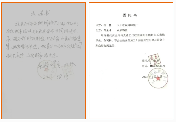 该公司营业执照名称为“南京金斗水产有限公司”,经查,自今年5月起该公司在南京农副产品物流配送中心收购死龙虾,集中销售给天长市众越饲料厂。执法人员现场查见天长市众越饲料厂的《营业执照》复印件、委托书,以及“将收集的死龙虾作为饲料原料加工使用”的承诺书。