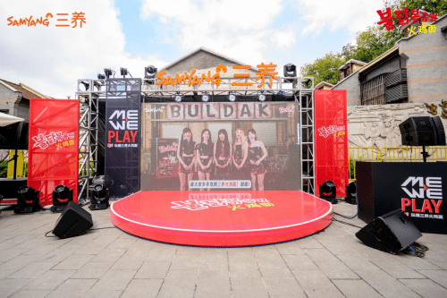 深谙“年轻化”之道的三养想要快速击中Z世代的美食观,携手韩国超人气偶像天团(G)I-DLE作为三养全球火辣推荐官(G)I-DLE,在全球各大社交平台掀起“MEWEPLAY”#玩爆三养火鸡面#的风潮。线上线下的广告投放打通流量闭环,渗透到消费者的日常生活场景。活动前期在抖音上进“MEWEPLAY”的女团舞PK赛,截止到活动前已达到数万人参与互动,更有狂热的粉丝团为应援自己心爱的idol前往线下进行打卡支持。快闪活动期间,线下招募到100个不同的团体进行舞蹈的表演,镜头下的一大群年轻人当音乐声响起,他们一个箭步冲到空地中央,跳起相同的舞,音乐停歇就退回原位,等待五秒之后的下一首歌曲,循环往复,伴随着爆款热单和经典曲目大家不由自主的跟着一起跳。气氛达到极致的高潮。